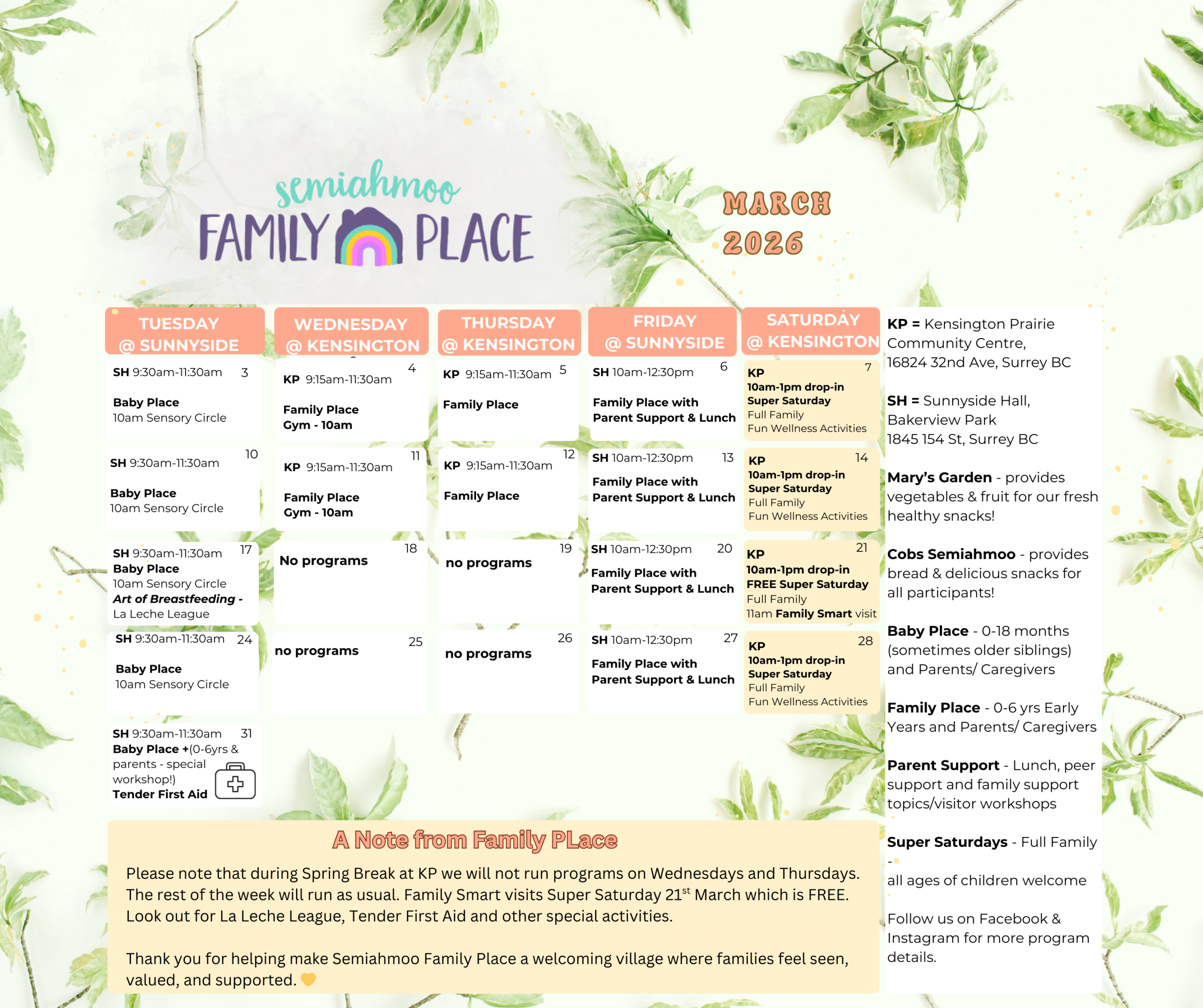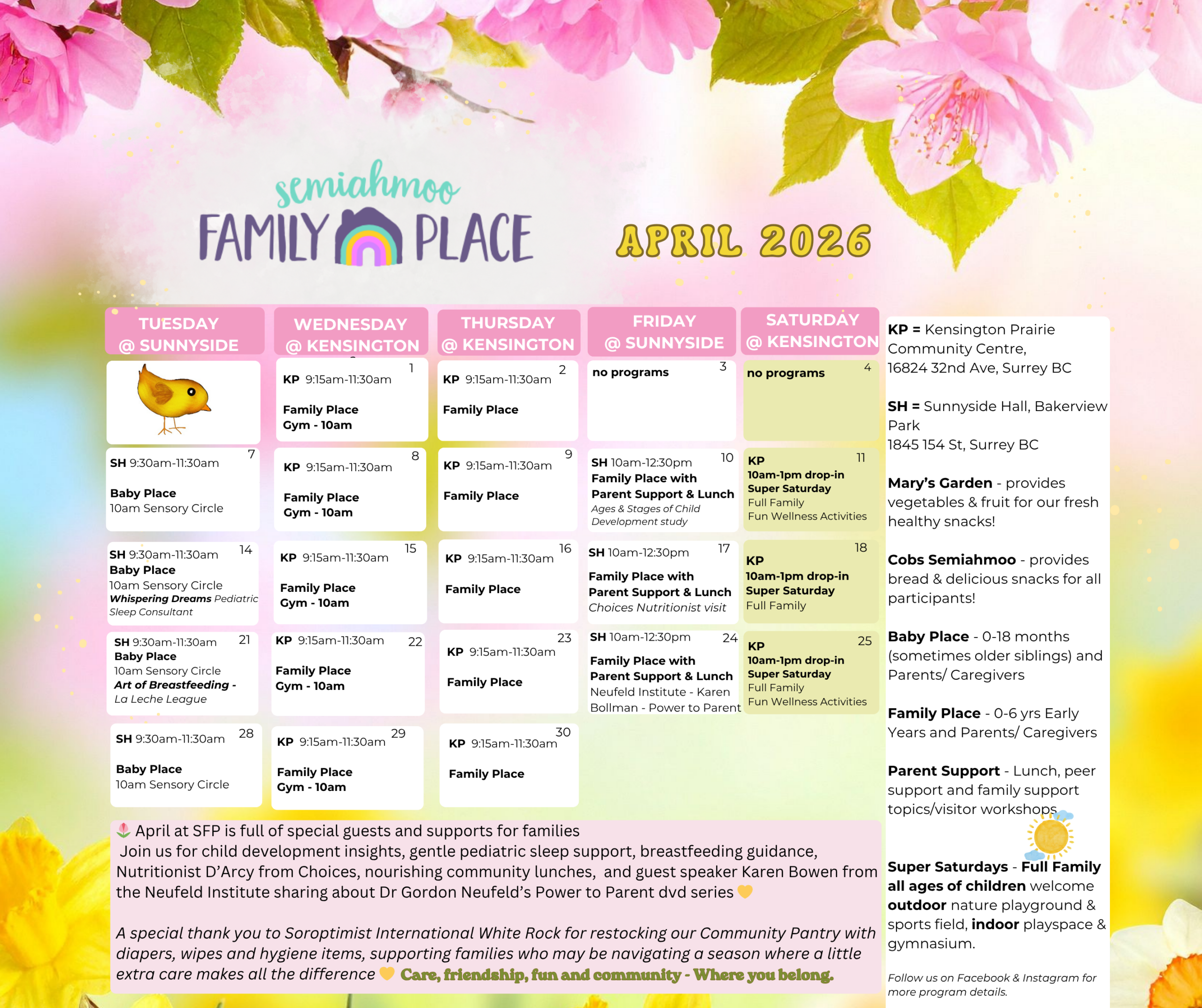 In September 2011, SFP found its home in the restored heritage building of Kensington Prairie Community Centre. Semiahmoo Family Place endeavours to provide a safe and engaging environment for children and their caregivers.